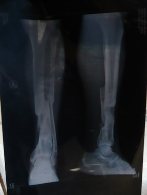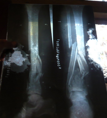 宋基福,男,江西省万载县三兴镇红旗村人,2004年在福建打工,后来以开出租摩托养家糊口。 2004年8月18日当天,和平常一样骑摩托车出门,不幸的是,当天发生了车祸,被另一辆摩托前轮撞到他的小腿, 导致右脚胫骨和腓骨多处骨折(从第一张X光片可以看出),另外,骨折处的肌肉和皮肤破坏得很严重, 整个右脚骨折处就大概剩下1/4正常皮肤,肌肉腐烂严重,属于严重的开放性骨折,其状况惨不忍睹!